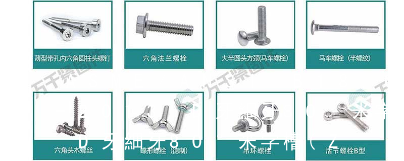 1.機螺釘 2.自攻螺釘 3.鉆尾螺釘 4.墻板釘 5.纖維板釘 6.木螺釘7.六角木螺釘 8.不脫出螺釘 9.組合螺釘 10.微型螺釘 11.家具螺釘 12.電子螺釘頭型:1.六角頭(hexagon head) 2.六角頭法蘭面(hexagon head with flange) 3. (鐵板牙自攻螺絲) B-2: Plastic Tapping Screw. (塑膠用,自攻螺絲) C: Wooden Screw : 木工螺絲 D: Drywall Screw :水泥墻螺絲 E: Self Drilling Screws鉆尾螺絲(不銹鋼鉆尾螺絲,復合材料鉆尾螺絲) F:膨脹螺絲,四片膨脹螺絲又